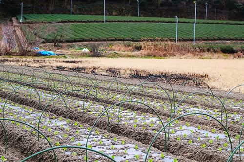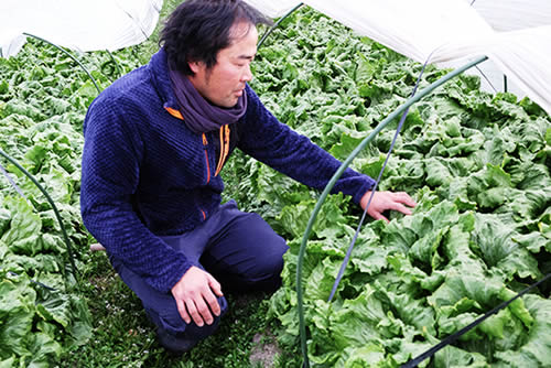 弓削さんは自然の環境に適応させていく露地栽培に魅力を感じています。「露地栽培は天候の影響を直接に受けます。たとえばレタスは気温の変化にとても敏感で、寒波が来ると成長が止まってしまいます。ビニールのトンネルを張り保温しますが、そのタイミングを考えながら作業することにも面白さを感じます」。